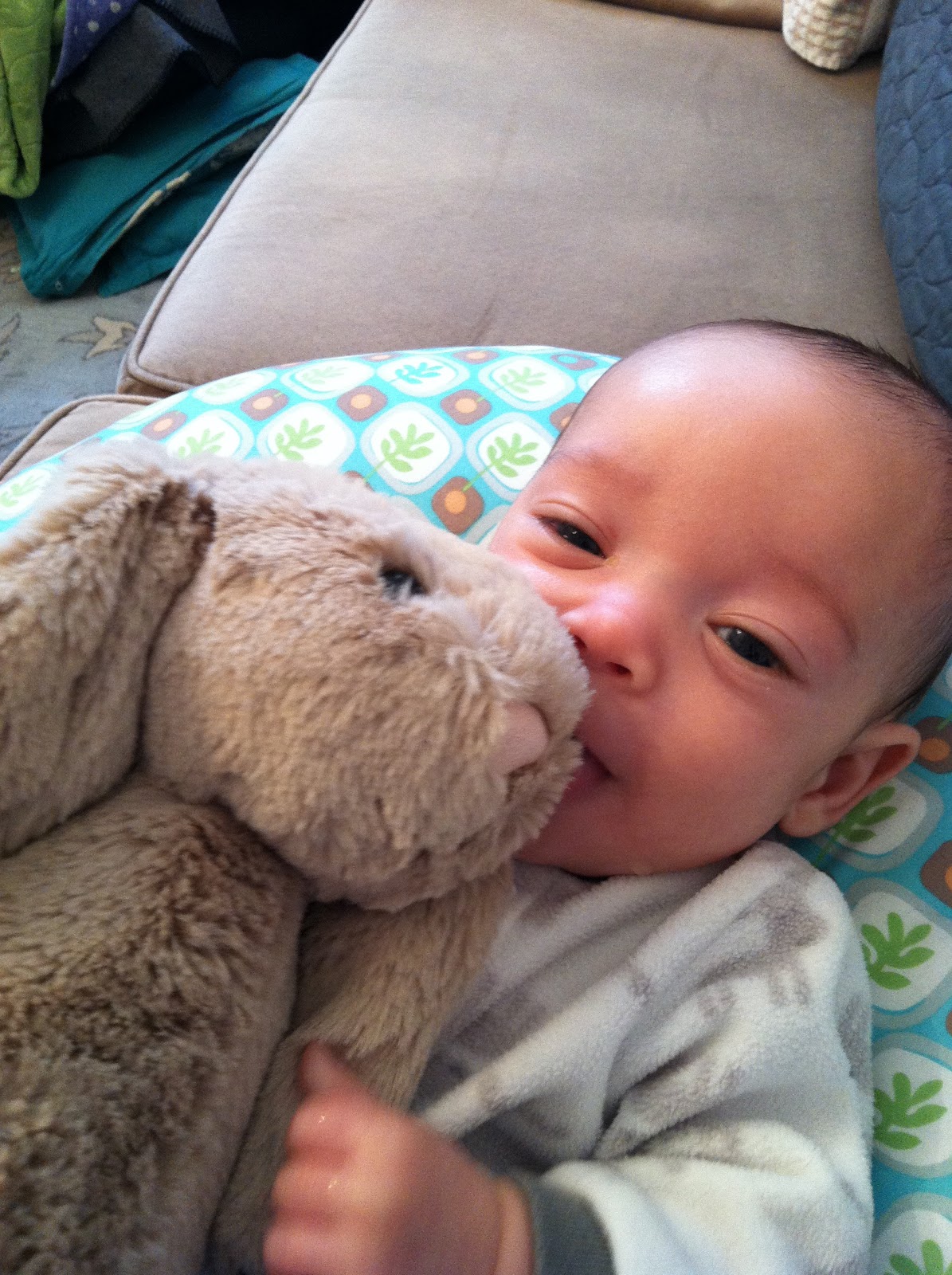 H is pretty much sleeping around 7-8 hours at night!  HALLELUJAH!  He is still sleeping in our room in his rock and play.  He's a pretty horrible napper during the day and only sleeps if he's in the car seat or in the Moby wrap.  Now that he's through the first 3 months, I've tried the transition into his crib.  So far I've been attempting a nap or two a day.  We've had a little bit of success!